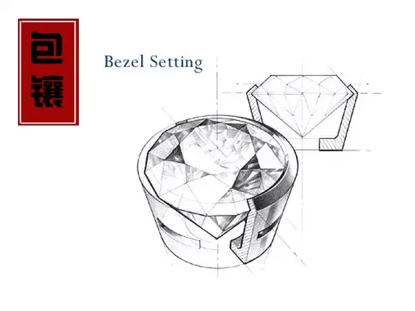 也是顾名思义,包镶就是,用金属把钻石腰部以下部位全部包裹起来的镶嵌方式。这种镶嵌方式的优点是,最牢固,并且可以良好的保护钻石的一种镶嵌方式。而且这种钻戒镶嵌方式更适合比较传统,比较低调的人。效果也是非常高贵,大气的。一般男戒都会选择这种镶嵌方式。