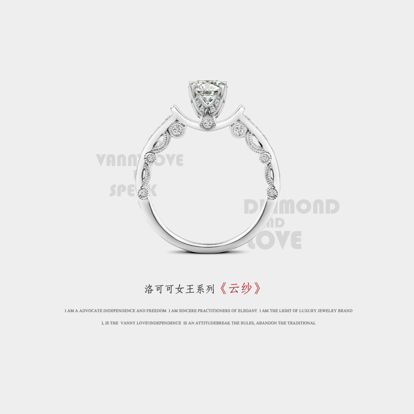 设计灵感来源于蕾丝公主婚纱元素,寓意优雅美丽。如同蕾丝裙摆的戒托采用滚珠边工艺,更加凸显公主气质的高贵优雅,同时此款也是梵尼洛芙珠宝的形象款喔。