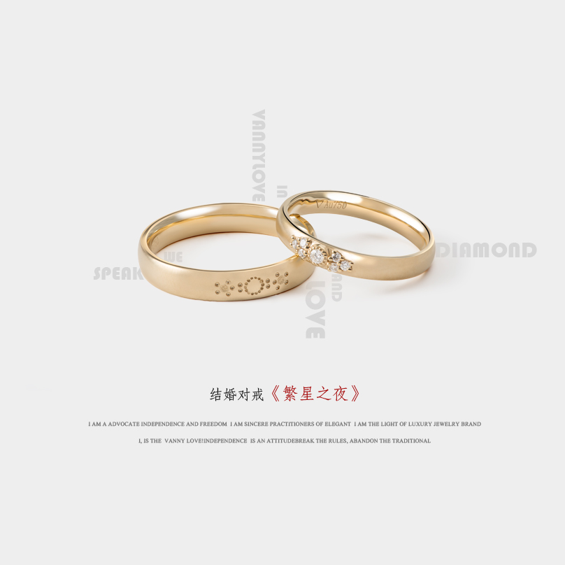 设计灵感来源于梵高的同名画作《繁星之夜》,星星,犹如大地、山川、河流。藏在时间的长河之中,更鼓存在,它是如此古老、神迷、遥远;又是如此年轻、亲切、美丽。优雅弧线,示意划破天际的银河,一半奢华,一半低调,就像我们的爱情,用幸福指环守护两个人的命运。