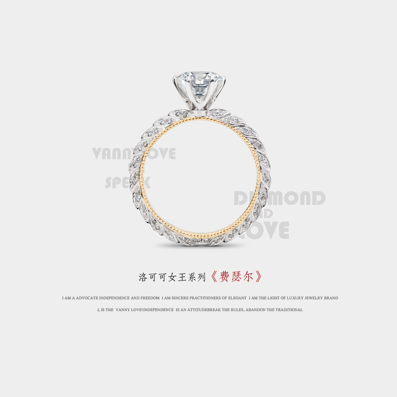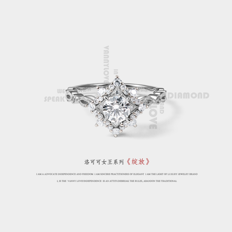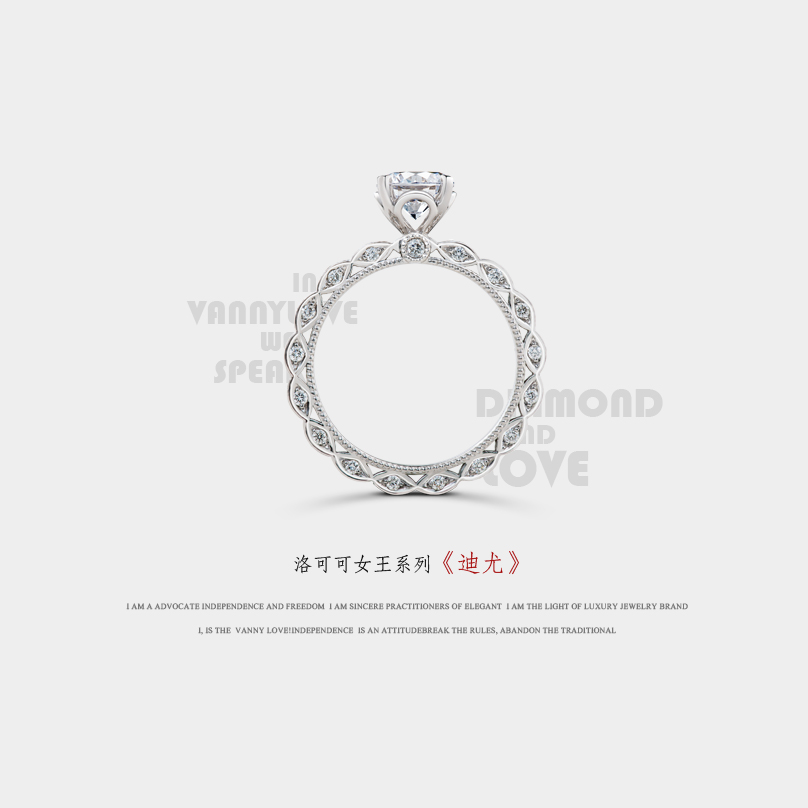 设计灵感来源于蕾丝公主婚纱元素,寓意优雅美丽。如同蕾丝裙摆的戒托采用滚珠边工艺,更加凸显公主气质的高贵优雅,同时此款也是梵尼洛芙珠宝的形象款喔。