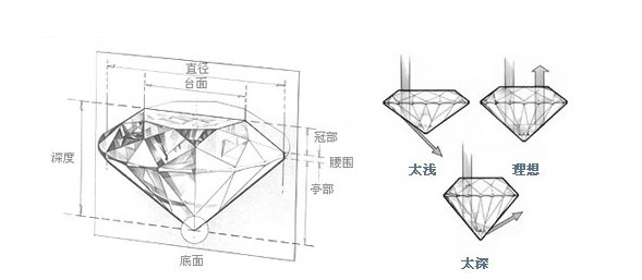 钻石的CUT(切磨)是指钻石切磨师在将原石打磨成钻石的过程中所切割的角度和比例。包括台宽比、冠高比、腰厚比、亭深比、底尖比、全深比、冠部角、亭部角、直径、高等等。