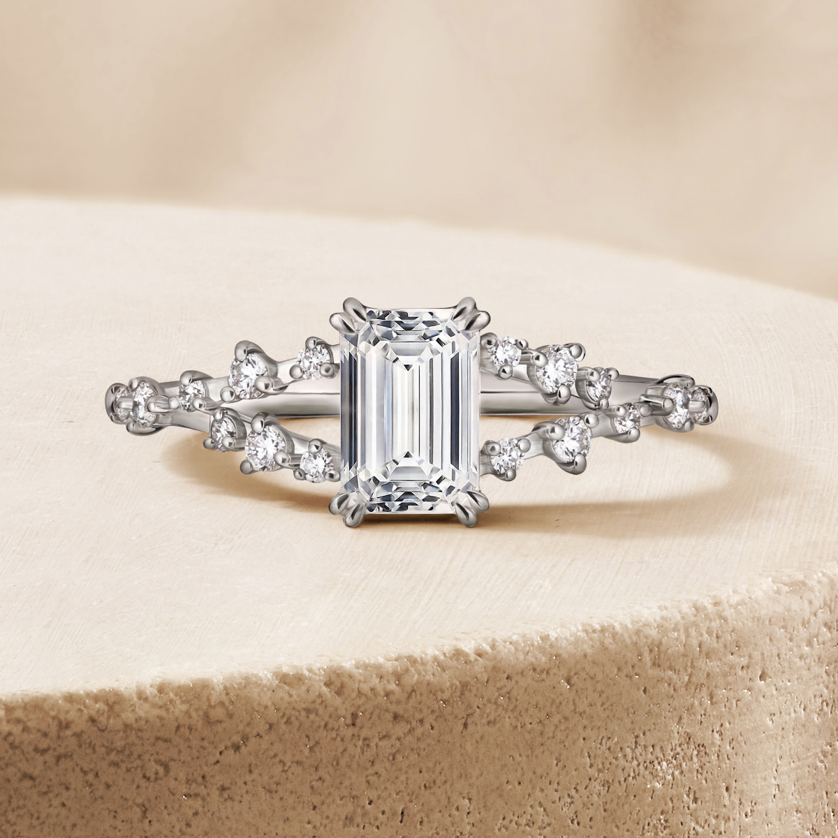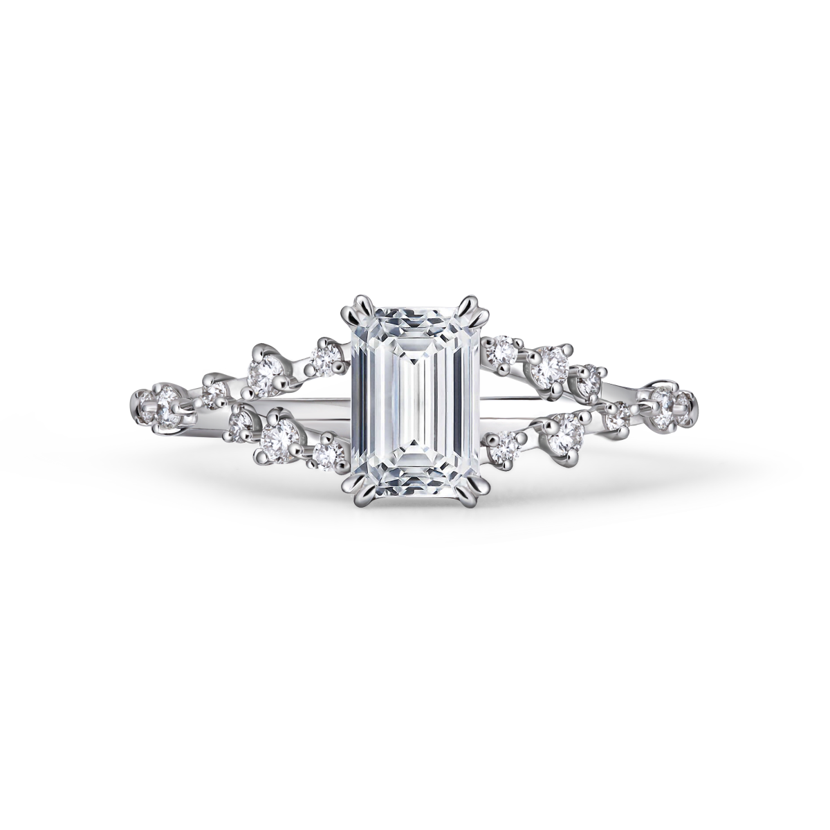 经典祖母绿钻石浮在轻巧戒臂之上,似一座连接恋人心房的桥,在粼粼水波中,映成一幅画。