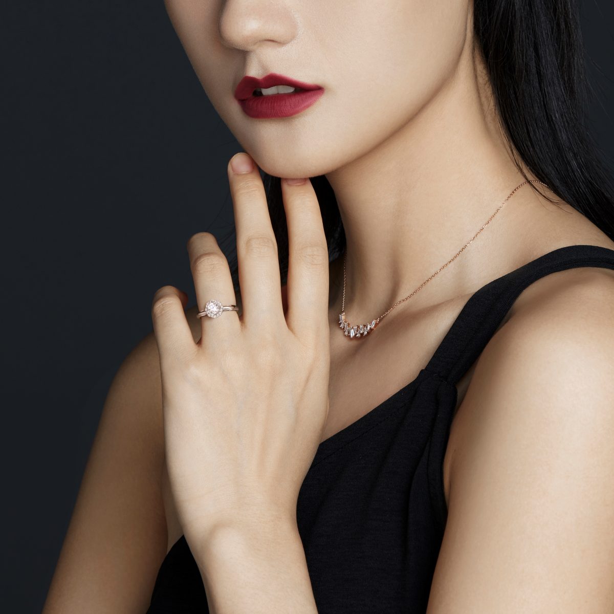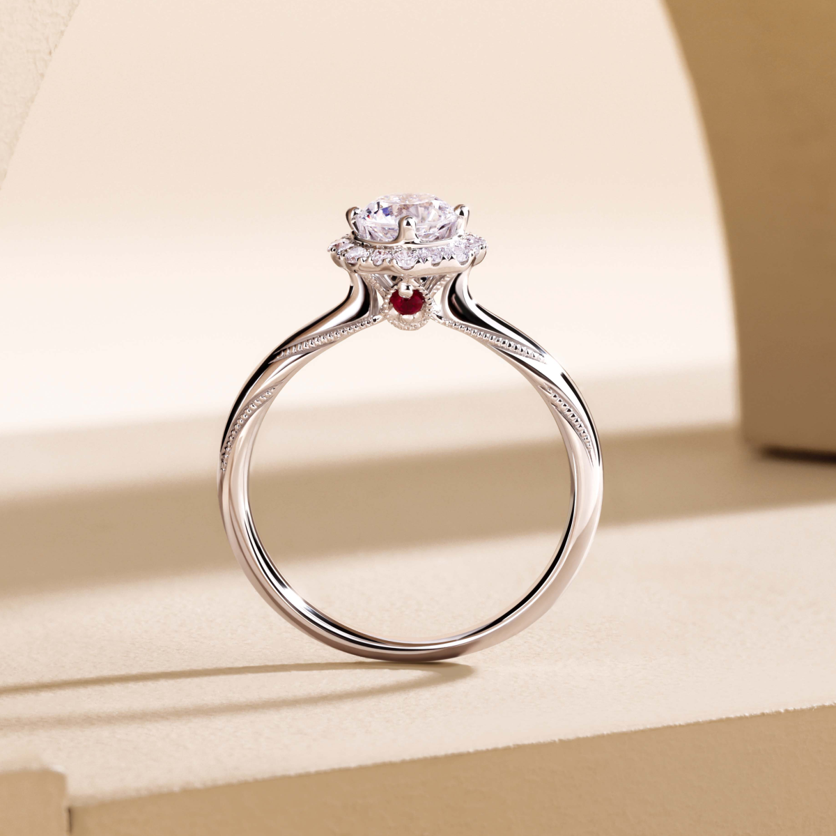 设计师采用群镶设计,展现出浪漫花簇的缤纷色彩;戒托尾部的红宝石,如同给花束打了一个结,将幸福爱情牢牢拴在手中。