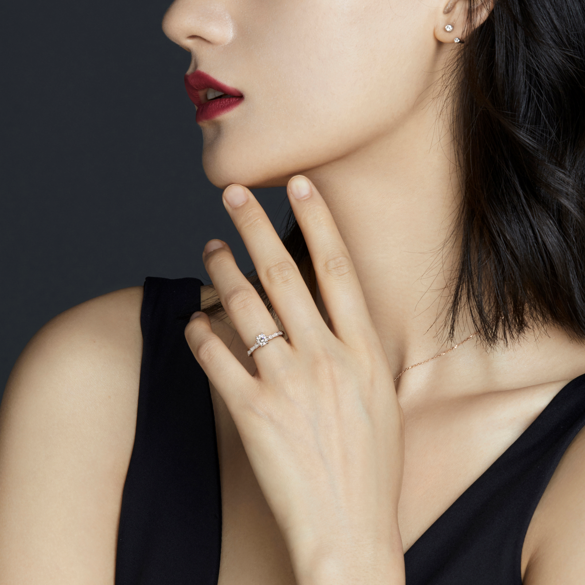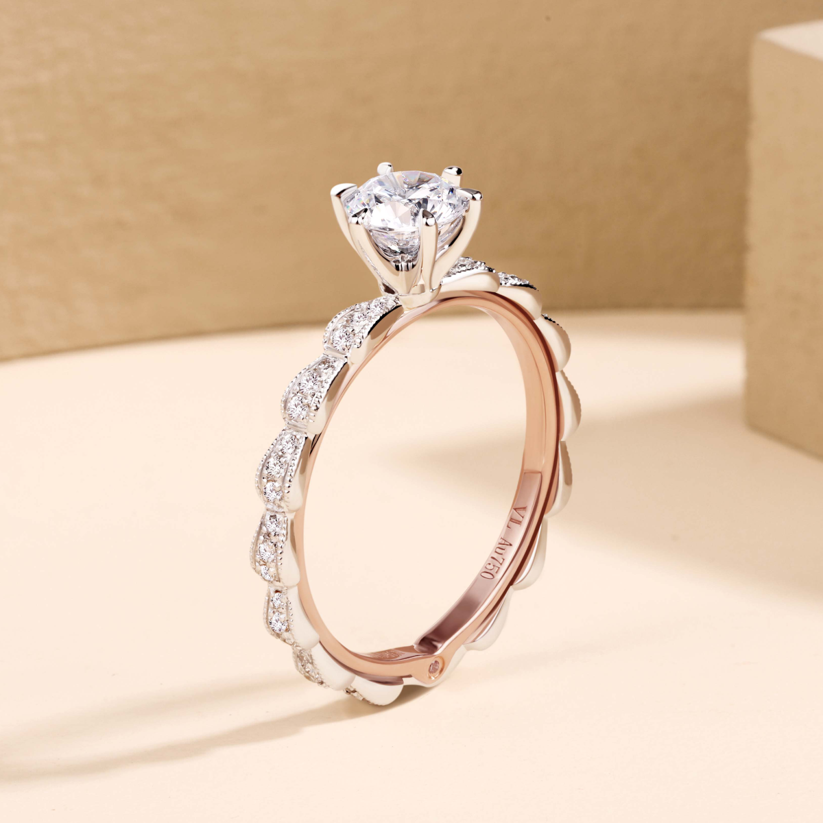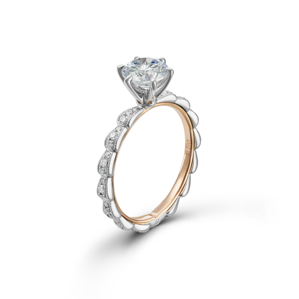 简洁镶爪包裹着的钻石,如含苞待放的花骨朵,搭配戒臂如露水滚落的动态,更衬你出尘纯洁的美。